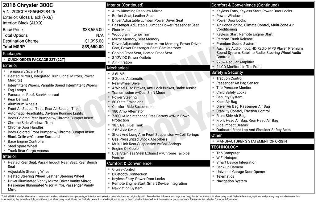Whether you're commuting in style or embarking on a road trip, this 2016 Chrysler 300 C offers the perfect combination of performance, technology, and refinement. Experience the difference for yourself and schedule a test drive today. We're confident you'll be impressed by this exceptional vehicle.