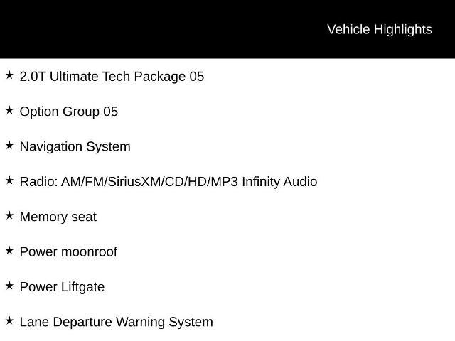 - 2.0T ULTIMATE TECH PACKAGE 05 -inc: Option Group 05, Smart Cruise Control, Electronic Parking Brake, auto hold, High Beam Assist, Auto-Leveling Headlights, Automatic Emergency Braking, pedestrian detection, Lane Departure Warning, Dynamic Bending Light (05)