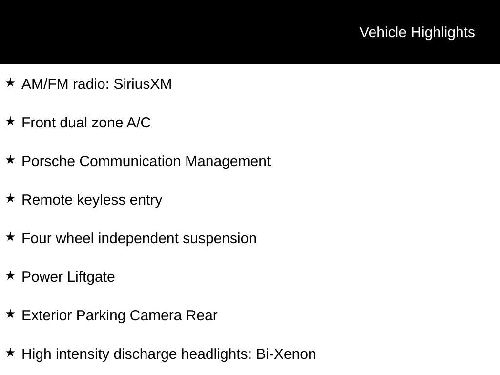 - Radio: Porsche Communication Management (PCM) -inc: CD/DVD drive, 11 GB internal jukebox storage, 2 USB slots, 2 SD card slots, Bluetooth® hands-free mobile phone connection, SiriusXM satellite radio, HD Radio, Sound Package Plus w/8 speakers, 150 watts, 7-inch TFT display, RDS double tuner radio, MP3 compatible single disc CD/DVD player and universal audio interface (Aux-In, USB, iPod)