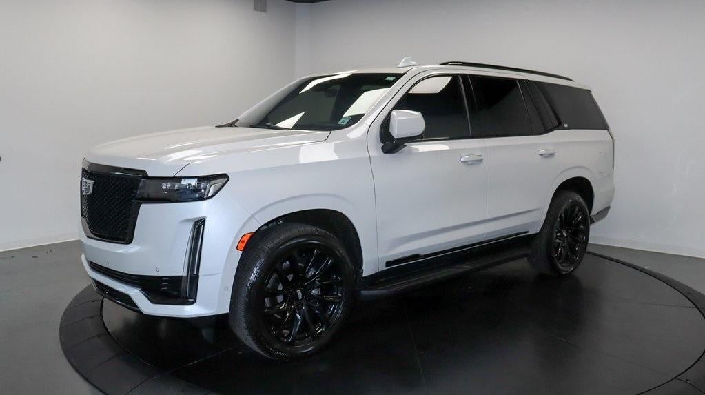 2021 Cadillac Escalade Sport, now available as a Cadillac Factory Certified vehicle and a local trade-in. This exceptional SUV boasts a commanding presence with its striking Crystal White Tricoat exterior and a sophisticated Black Leather interior, perfectly complementing its robust 4WD system.