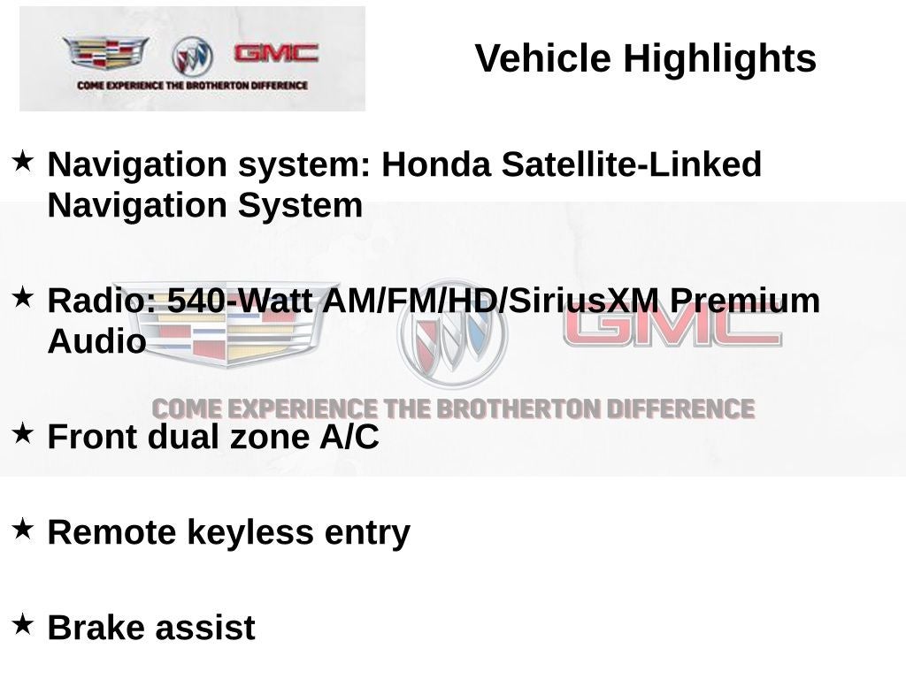 - Radio: 540-Watt AM/FM/HD/SiriusXM Premium Audio -inc: 12 speakers w/subwoofer, 7" display audio w/high-resolution electrostatic touch-screen and customizable feature settings, Honda Satellite-Linked Navigation System (only available in the United States except Alaska) w/voice recognition and Honda HD digital traffic, HondaLink, Apple CarPlay integration, Android Auto integration, 1.0-amp USB audio interface port in center console, 1.5-amp USB smartphone/audio interface port in front console, Bluetooth® HandsFreeLink and streaming audio, SMS text message function, Radio Data System (RDS) and Speed-Sensitive Volume Control (SVC), SiriusXM requires a subscription after any trial period, If you decide to continue your SiriusXM service at the end of your trial subscription, the plan you choose will automatically renew and bill at then-current rates until you call SiriusXM at 1-866-635-2349 to cancel, See our customer agreement for complete terms at www.siriusxm.com, Fees and programming subject to change, Available in the 48 contiguous United States and D.C, SiriusXM and all related marks and logos are trademarks of SiriusXM Radio Inc
