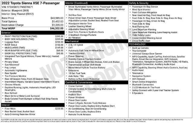 Powered by a robust 2.5L I4 Hybrid engine with AWD, the Sienna XSE delivers an exceptional blend of performance and efficiency, with an impressive 35 city / 36 highway MPG rating. This exceptional fuel economy, combined with the generous cargo space and seating for up to 7 passengers, makes the Sienna XSE the ultimate family-friendly vehicle.