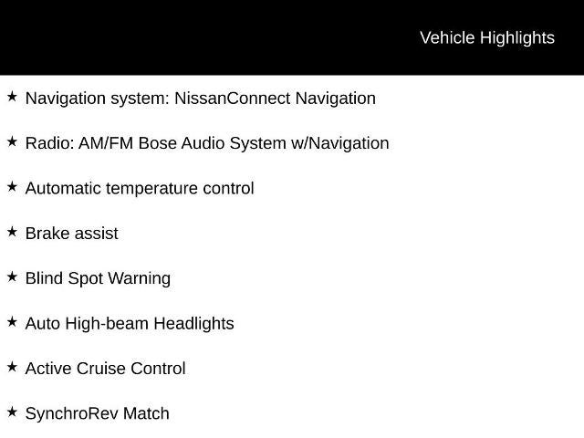 - Radio: AM/FM Bose Audio System w/Navigation -inc: active noise cancellation, active sound enhancement, 8-speakers, 9" touchscreen audio display, illuminated steering wheel-mounted controls, Bluetooth® hands-free phone system, streaming audio via Bluetooth®, SiriusXM radio, wireless Apple CarPlay, Android Auto, hands-free text messaging assistant, voice recognition, Siri Eyes Free, NissanConnect services w/WI-FI hot spot, 1 USB Type-A and 1 USB Type-C