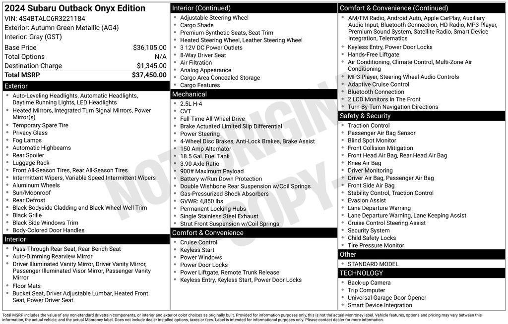 Don't miss your opportunity to make this exceptional SUV your own. Visit our showroom today and let us demonstrate the true power and versatility of the Outback Onyx Edition. We're confident you'll be impressed by its uncompromising performance and refined, yet adventurous, personality.
