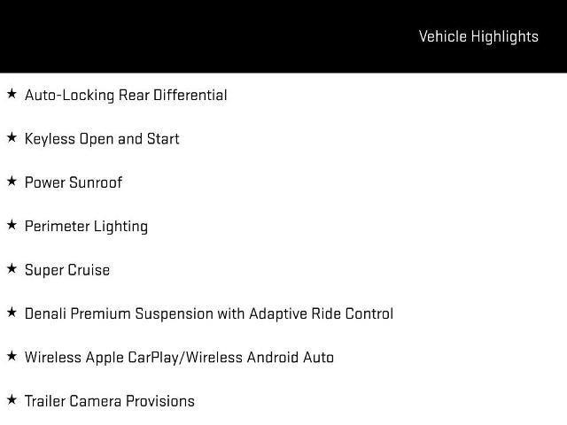 Elevate your driving experience with the Denali Premium Suspension with Adaptive Ride Control, the Multicolor 15" Diagonal Head-Up Display, and the Wireless Apple CarPlay/Wireless Android Auto integration. Enjoy the ultimate in comfort and convenience with the Heated Steering Wheel, Heated and Ventilated Front Seats, and Heated Rear Outboard Seats.